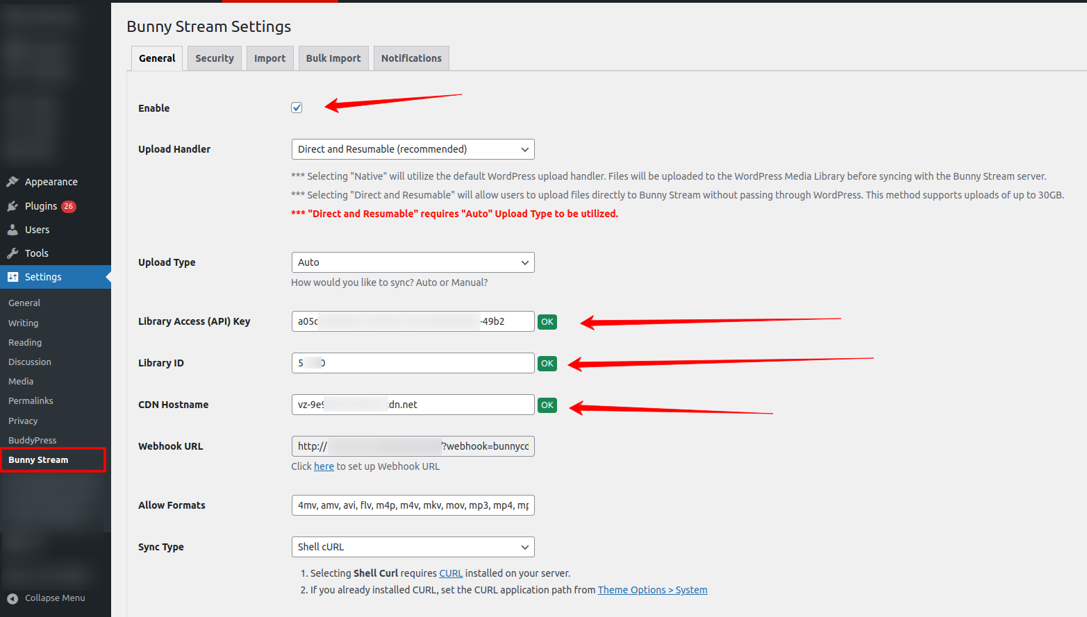 From WordPress backend, navigate to **Settings > Bunny Stream**, enter your the keys and click the **Save Changes** button, remember to check the **Enable** checkbox.