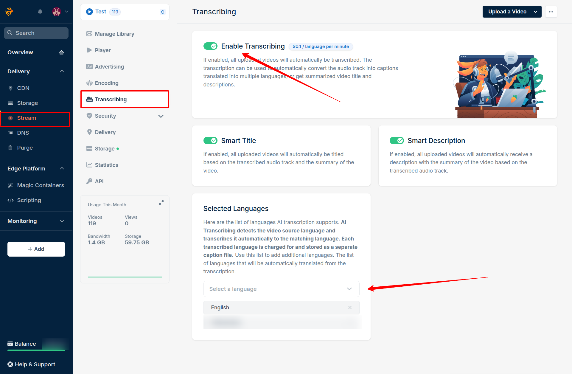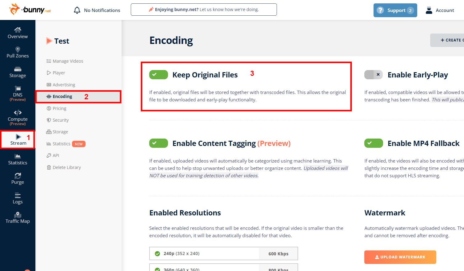 **Step 2**: Go to your Bunny **Dashboard > Stream** page, choose the **Library**, click the **Encoding** menu and enable the **Keep Original Files** option.