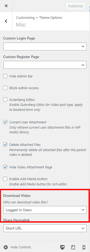 **Step 1**: To enable the Download feature, go to **Appearance > Customize > Theme Options > Misc**, In this section, turn on the Download button and choose whether to allow non-logged in users or only logged-in users to have the download permission.<br>