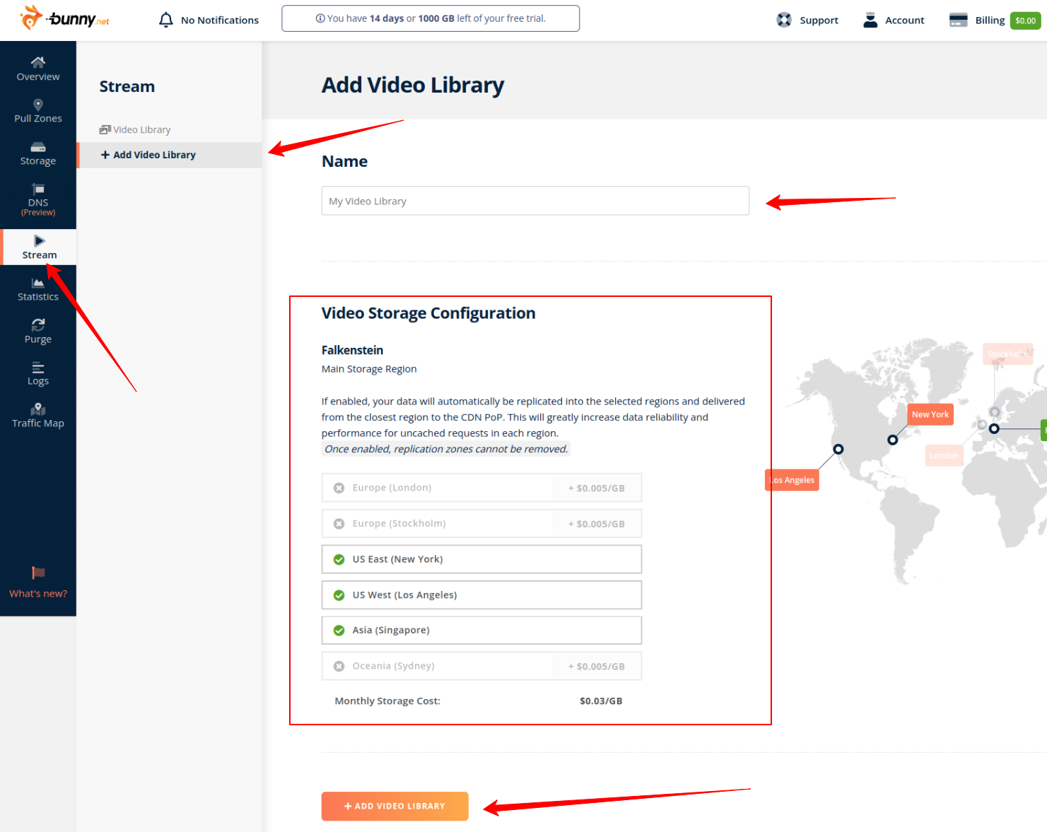 Navigate to **Stream > Add Video Library**, fill the name, choose **Storages** and click the **Add Video Library** button