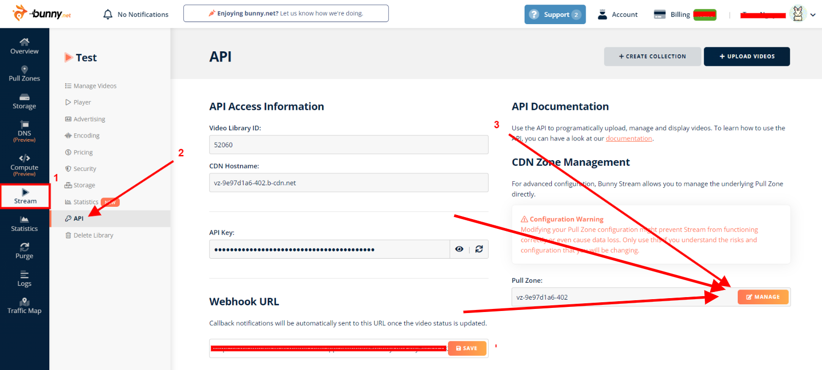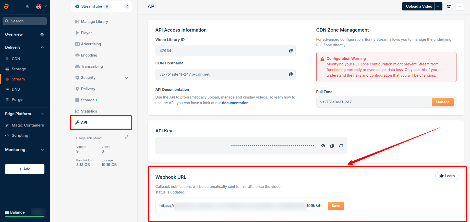 Go to the Bunny Stream's API tab, enter your Webhook URL, save changes.