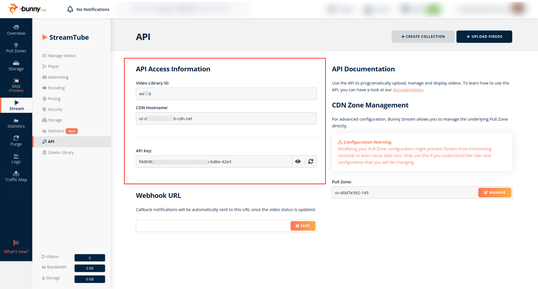After adding Library successfully, click on the **Library > API** tab, copy the **Video Library ID**, **CDN Hostname** and **API Key**