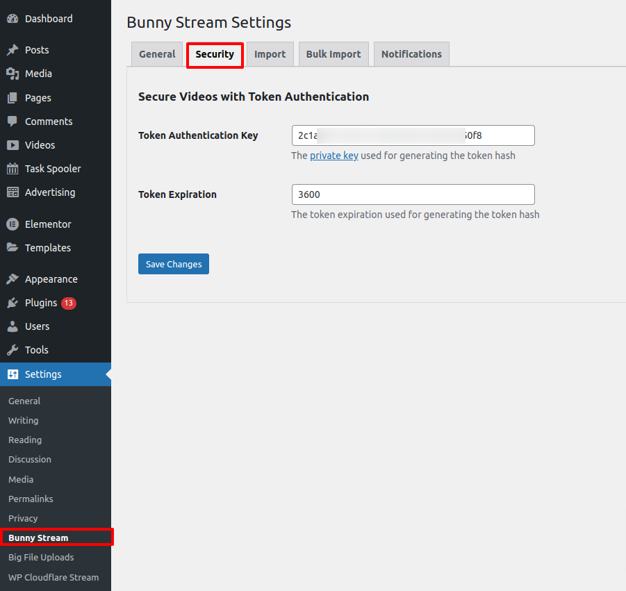 Navigate to the Security tab, and enter your **Token Authentication Key** along with a custom expiration time