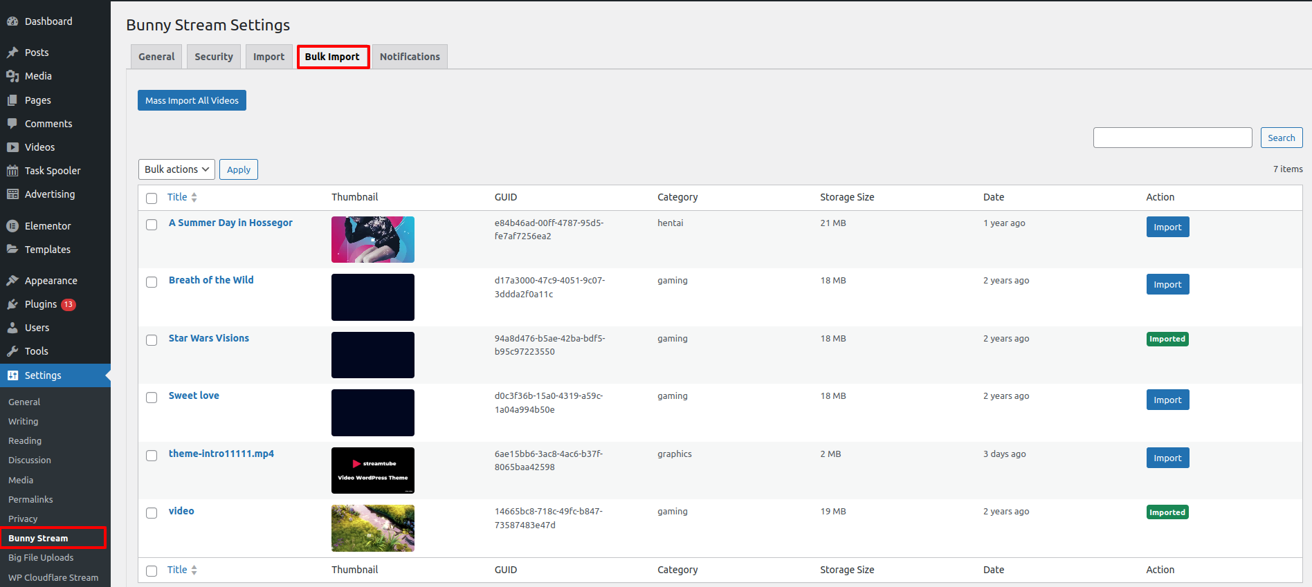 With this feature, you can bulk import all videos or specific ones from Bunny into your WordPress website.