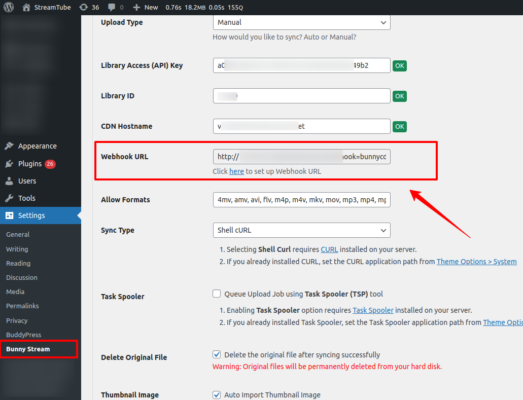 Navigate to **Settings > Bunny Stream** and copy your Webhook URL.